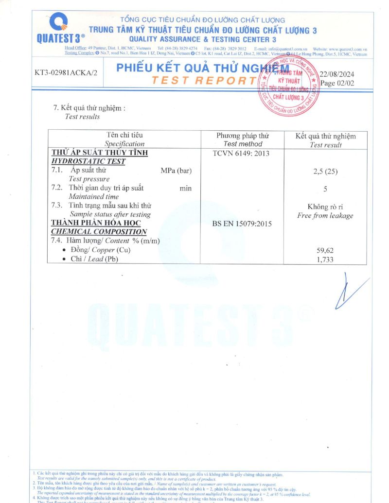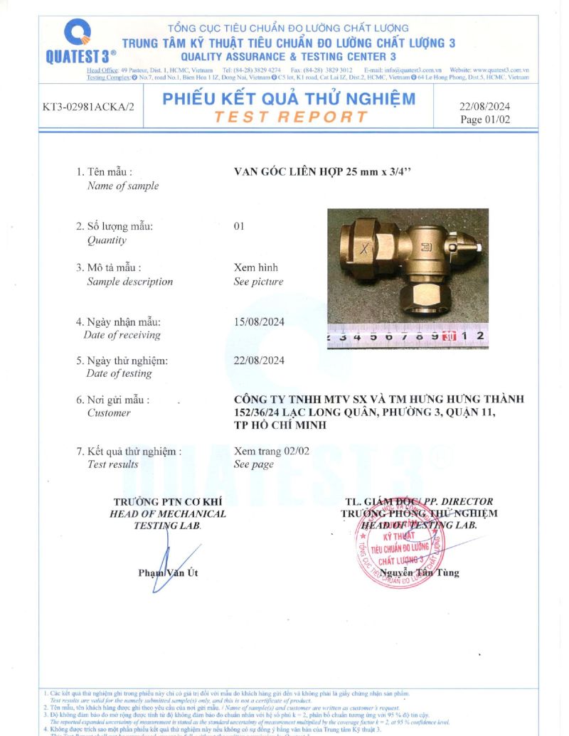 Kết quả thử nghiệm Van góc liên hợp 25mm x 3/4