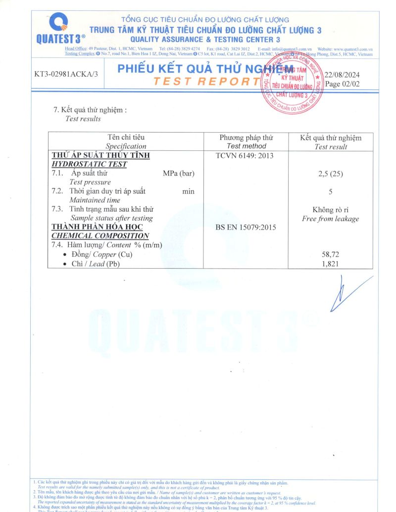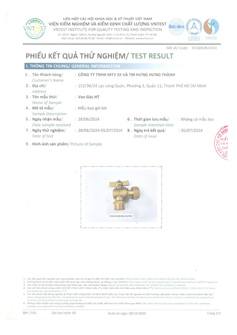 Kết quả thử nghiệm Van góc 25mm x 3/4
