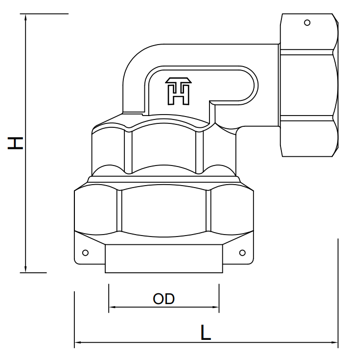 - Thân khuỷu: một đầu kiểu cơ khí để nối (thúc) với ống OD25mm và đầu còn lại là ren trong để lắp với van bi FM