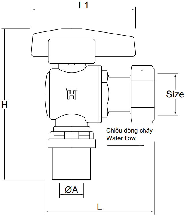 - Thân van gồm một đầu ren ở vị trí nằm ngang kiểu nối sống (Raccord d’union – đai ốc xoay) có ren G3/4’' để nối với đồng hồ nước 15ly, đầu còn lại ở vị trí thẳng đứng có ren G3/4’’ ren ngoài để nối ống sau đồng hồ nước khách hàng.