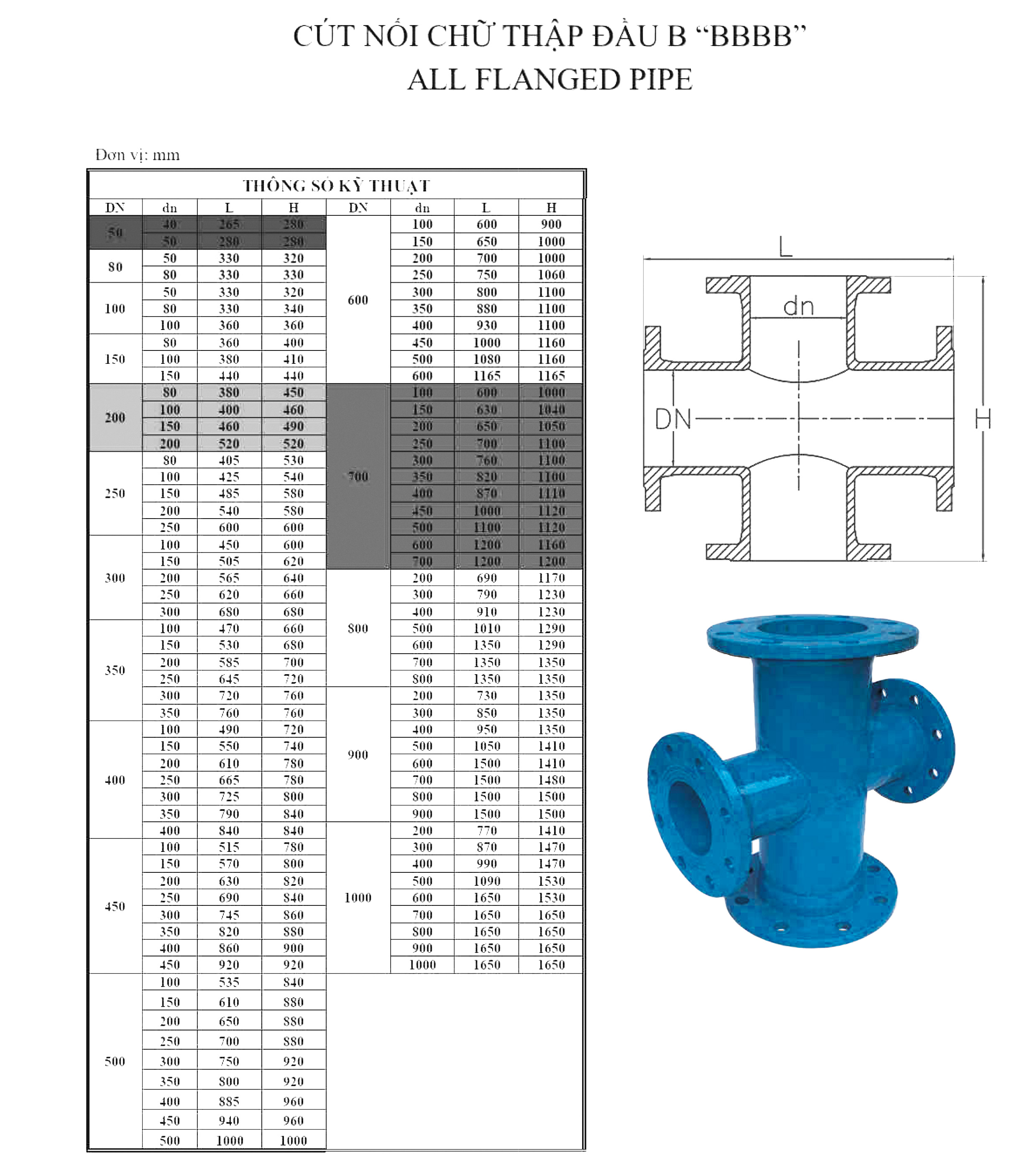 Tên gọi "BBBB" chỉ kiểu kết nối của phụ kiện: 4 đầu đều là mặt bích để kết nối với ống hoặc các thiết bị khác bằng bulong.