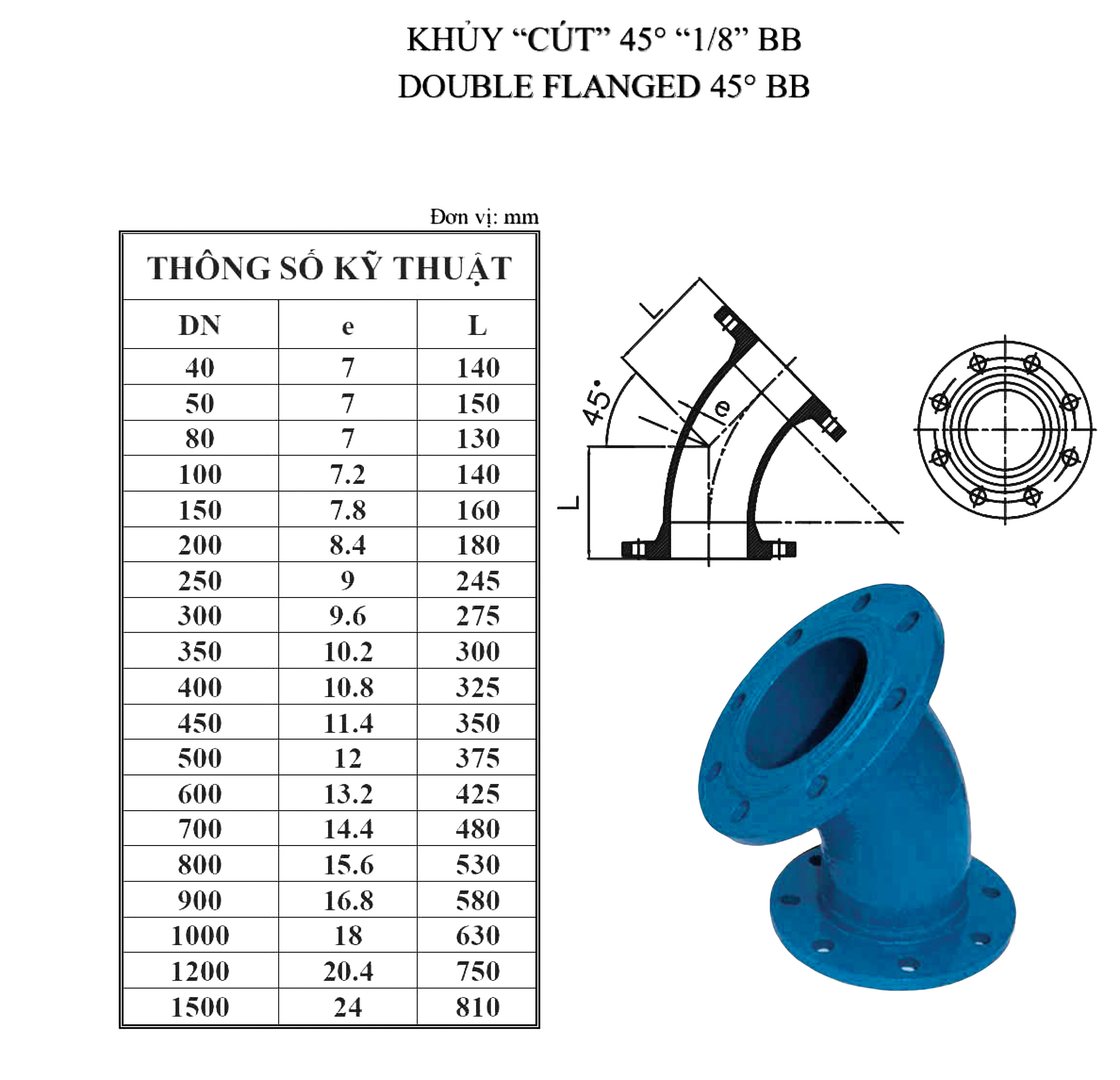 Co góc 45° (1/8) giúp chuyển hướng êm, giảm tổn thất áp lực.