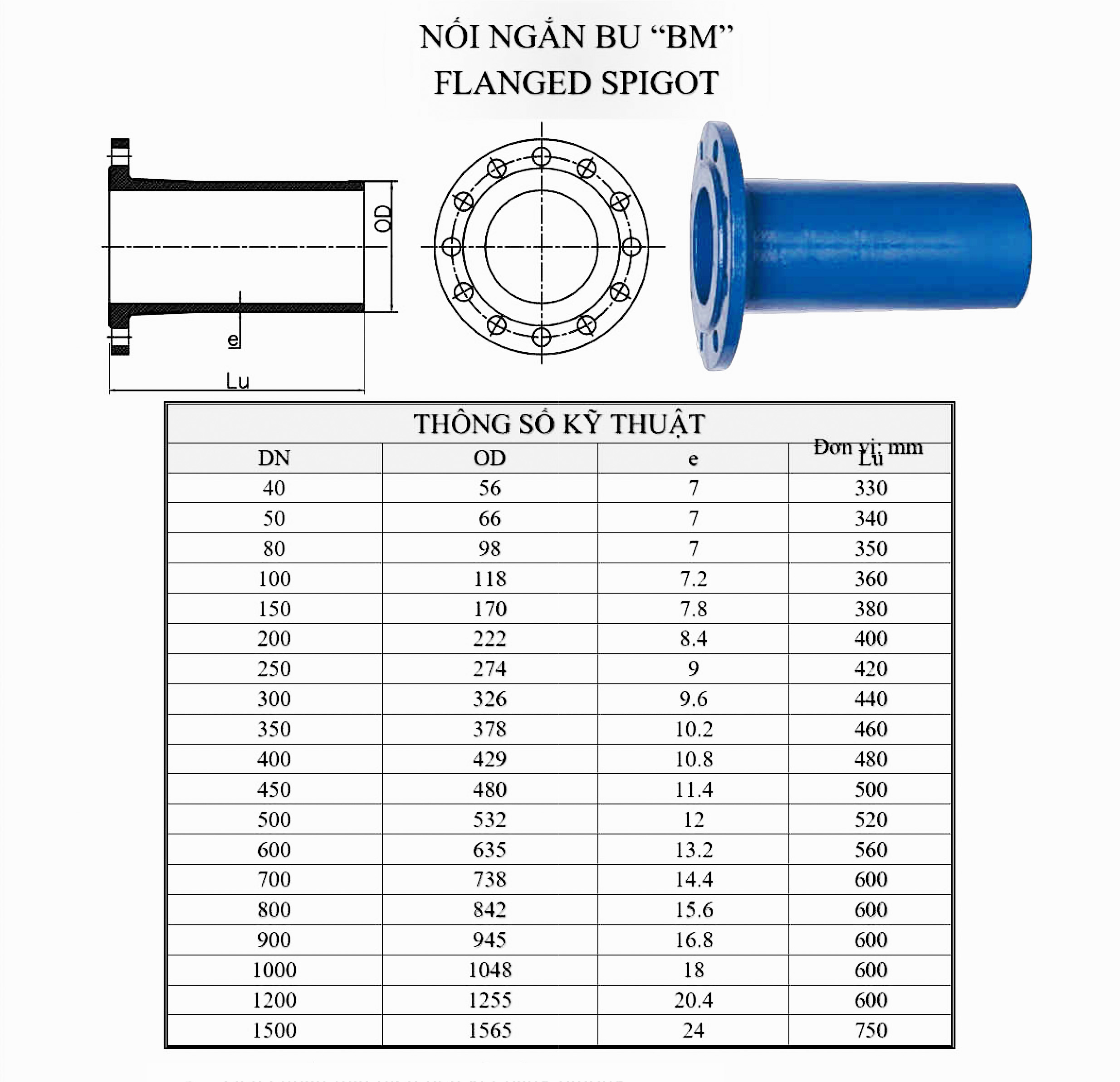 Đầu kết nối dạng BU gồm 1 mặt bích (B) và đầu trơn (U).