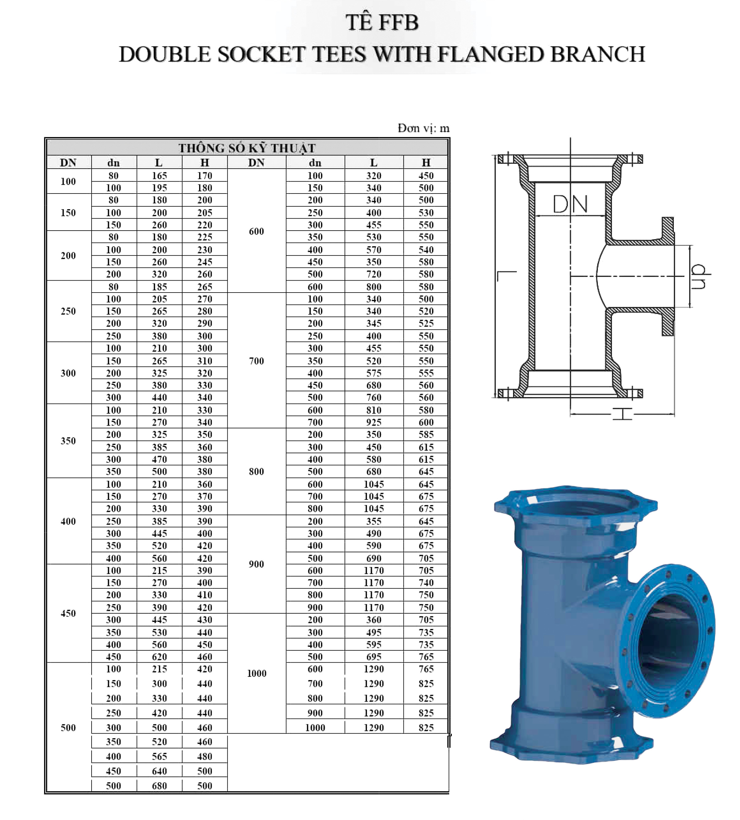 Tê FFB là phụ kiện chia nhánh dòng chảy trong hệ thống đường ống, có kết cấu đặc biệt với hai đầu ren (FF) và một đầu mặt bích (B).